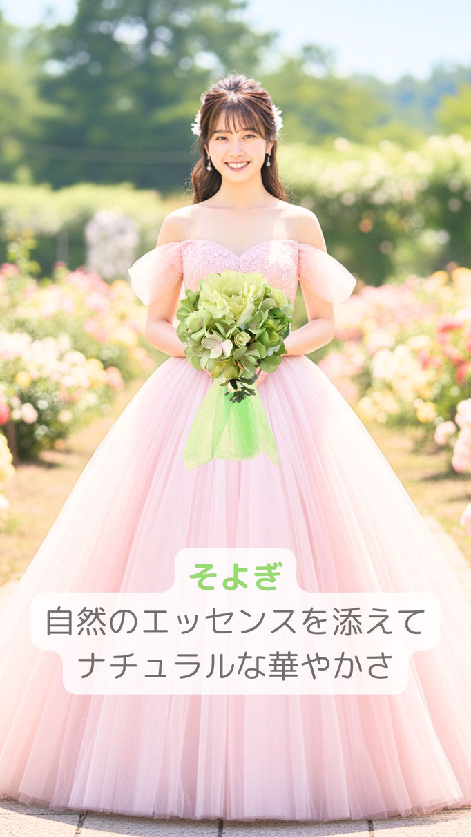 💚 そよぎ(グリーン) | 柔らかい印象の中にナチュラルな生命感を添える、ガーデン婚や屋外撮影に◎。 |